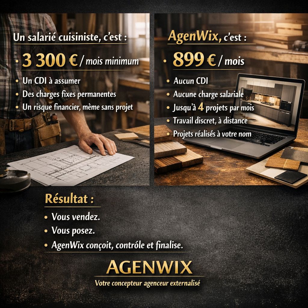 Bonus exclusif inclus : le Manuel du Cuisiniste Moderne + bonus « Utiliser AgenWix comme levier en rendez-vous » (mini-méthode en 5 étapes + phrases prêtes à dire).